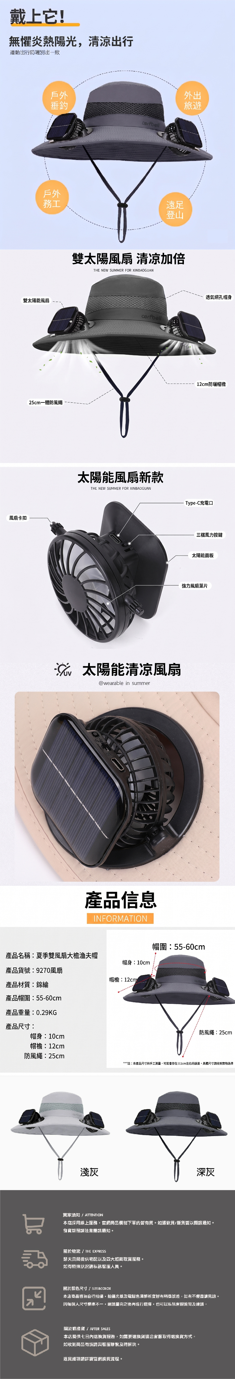 材質特性:高效光感太陽能板、Type-C充電口、UPF 50+ 科技防曬面料、高透氣排汗網眼。