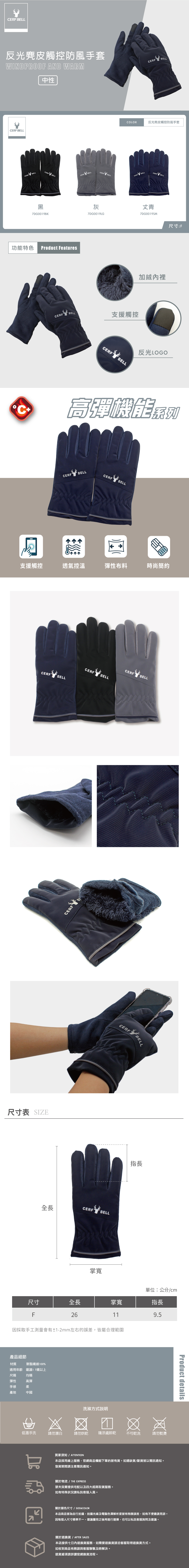 材質特性:麂皮拼接+防風設計+靈敏觸控+反光安全條+保暖內裡