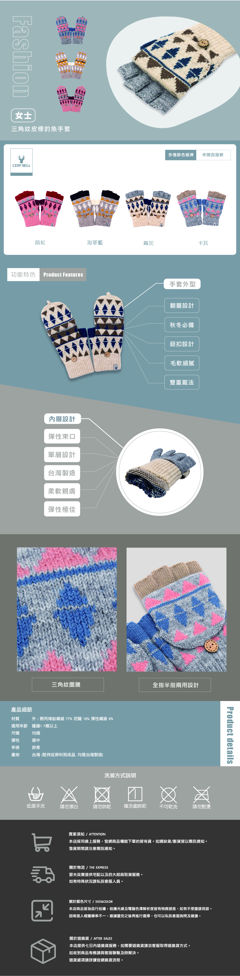 產品描述:女士三角紋皮標半指釣魚手套,透氣耐磨材質清爽舒適,半指設計靈活方便。掌心止滑防護穩定,搭配三角紋與皮標點綴,兼具時尚造型與釣魚實用功能。"