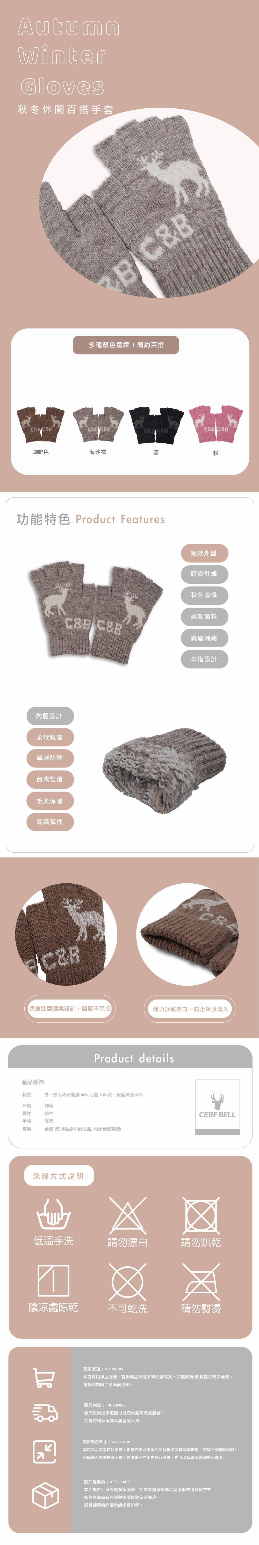 產品描述:女士麋鹿刺繡經典半指手套,單層針織柔軟保暖,透氣舒適不悶熱。半指設計靈活操作,麋鹿刺繡點綴增添造型感,簡約百搭,適合冬季通勤與日常穿搭。
