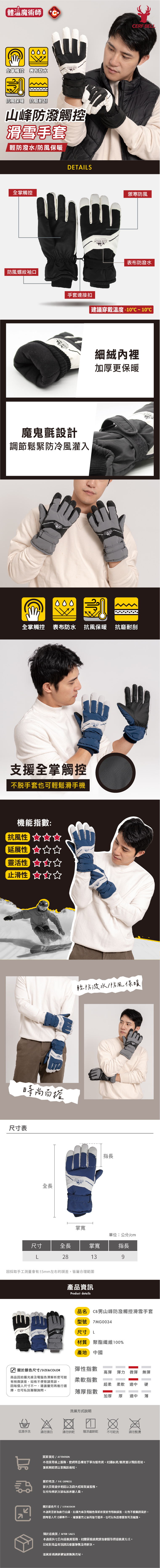 材質特性:輕量、防風、防潑水、掌面止滑處理、內裏加厚保暖層、螺紋束口、手套連接扣。