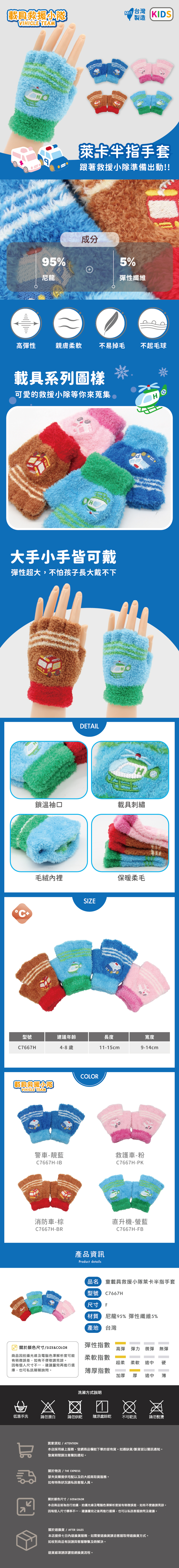 設計定位:結合汽車救援主題與半指剪裁,童趣與機能兼具,實用又有型。