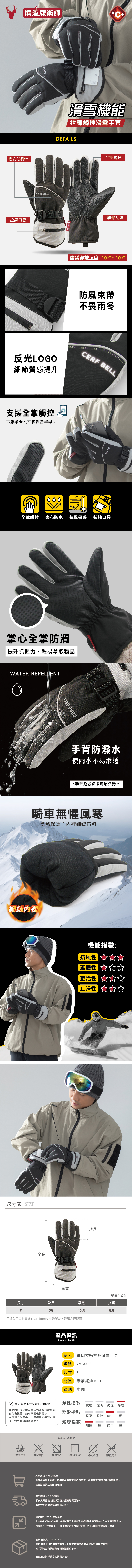 材質特性:高密度防風防水布料、內層加絨保暖鎖溫、拉鍊口袋設計方便收納、指尖靈敏觸控操作、掌心防滑強化耐磨,長時間使用不打滑。