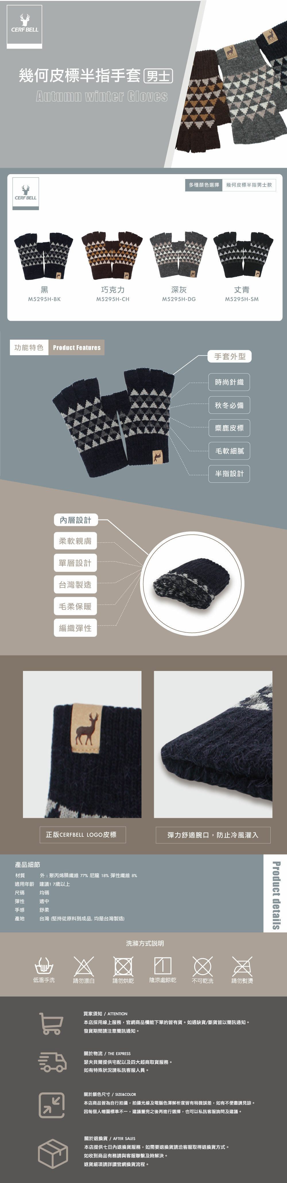 產品描述:男士幾何麋鹿皮標半指手套,柔軟針織材質舒適保暖,透氣不悶。半指款靈活操作方便,幾何紋理結合麋鹿皮標點綴,展現質感與造型,適合通勤與日常休閒。