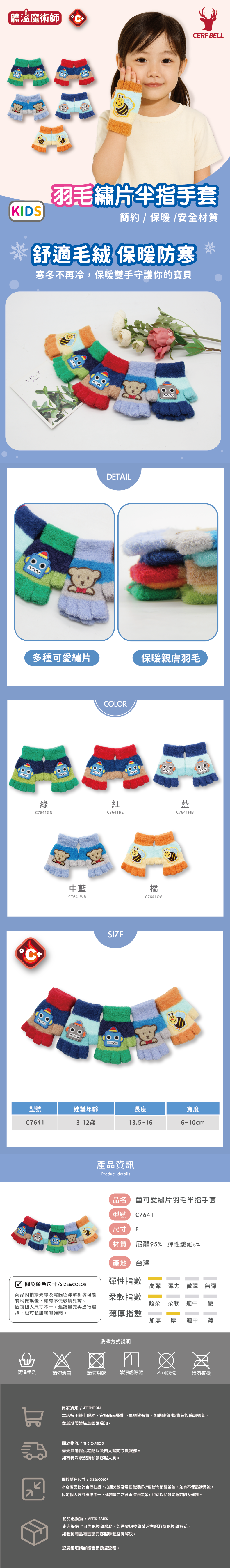 以柔軟針織材質製成,內裡細絨親膚保暖,指尖開口方便活動。可愛繡片增添活潑氛圍,是孩子冬季保暖與造型兼具的貼心選擇。