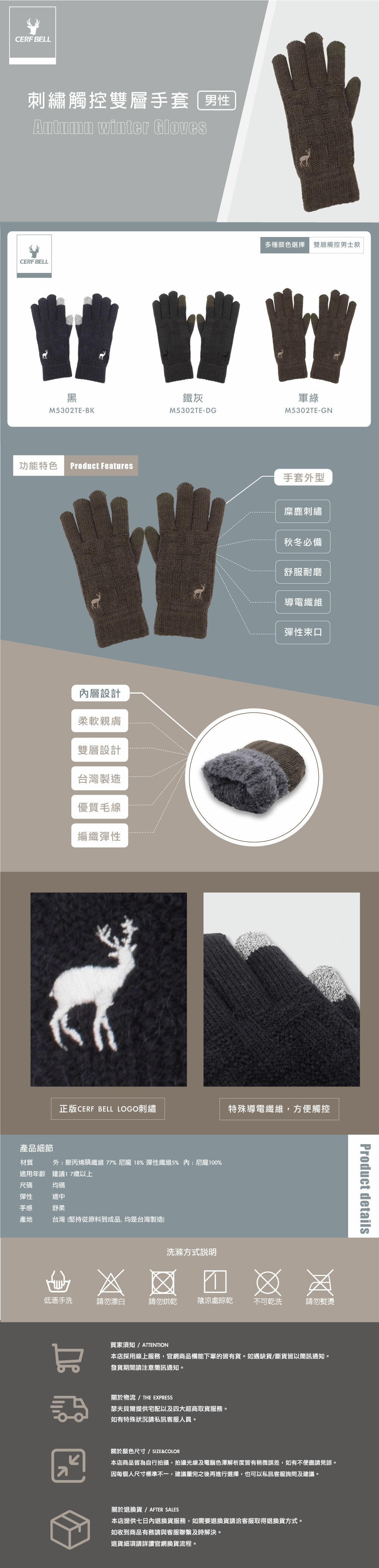 材質特性:雙層加厚設計+柔軟保暖內裡+靈敏觸控+精緻麋鹿刺繡