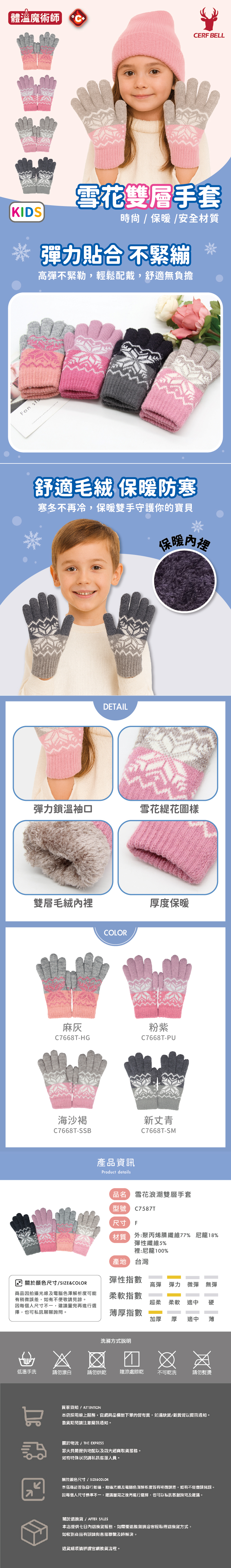 以細緻針織外層與柔絨內裡雙層結構打造,鎖溫防寒又親膚。雪花浪潮紋理展現冬日質感,是通勤與旅行必備的暖手良伴。