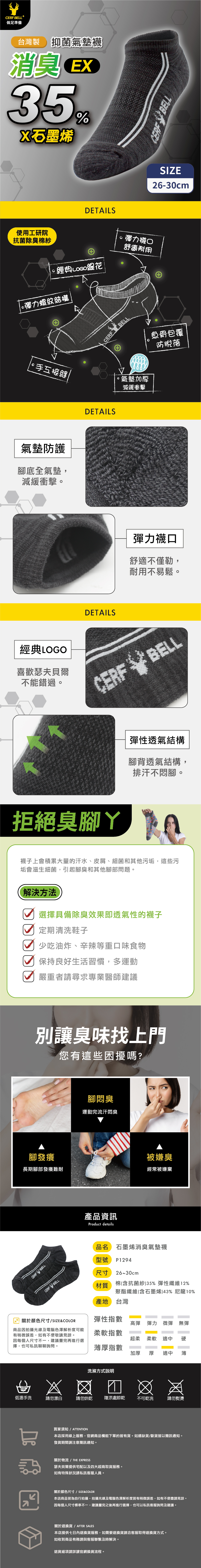 材質特性:石墨烯遠紅外線纖維|天然抑菌除臭|厚底氣墊減壓|MIT製造耐穿不鬆垮
