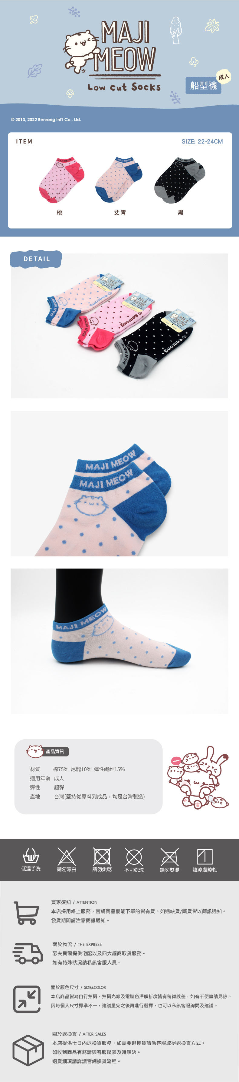 正版授權麻吉貓點點船襪,成人款設計,採用柔軟棉料製作,舒適透氣不悶熱。經典點點搭配麻吉貓元素,俏皮可愛又百搭。合腳剪裁不易滑落,耐穿舒適,日常休閒、通勤或居家皆適合
