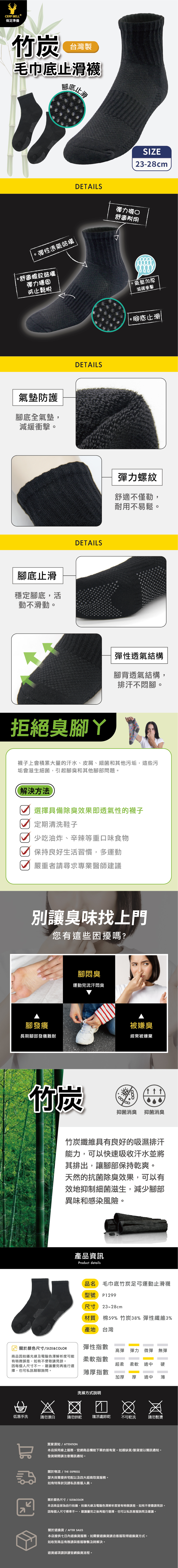 竹炭毛巾底消臭止滑運動襪,嚴選竹炭纖維,抑菌消臭透氣乾爽。加厚毛巾底設計提供減震支撐,運動或久站更舒適。止滑耐磨設計提升穩定性,久穿依然合腳耐用,是日常與運動必備機能襪。