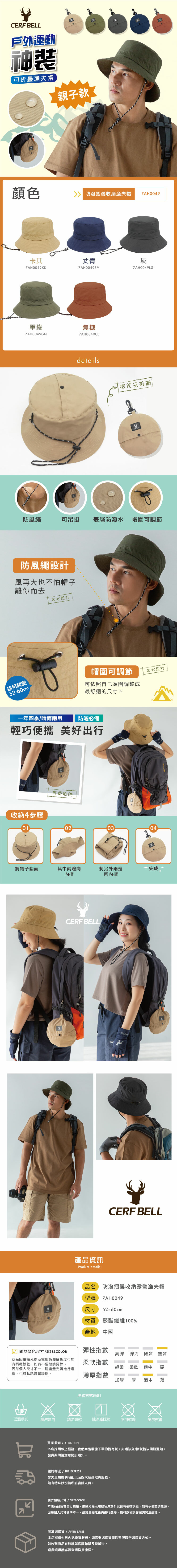 材質特性:防潑水布料、輕盈快乾、可摺疊設計、可調節帽圍、寬帽沿遮陽