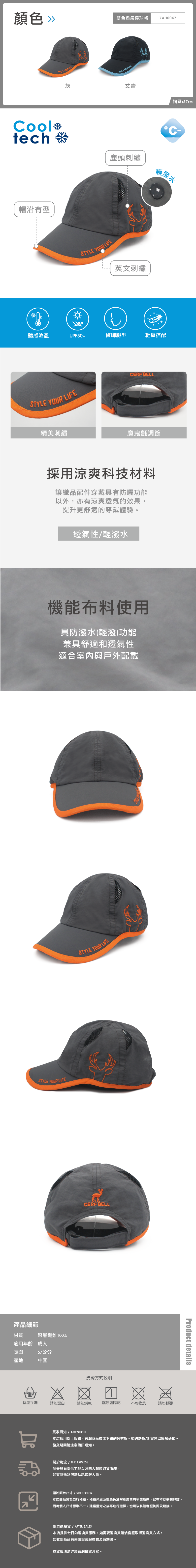 材質特性:輕盈透氣布料、雙色拼接、立體刺繡設計、可調節帽圍