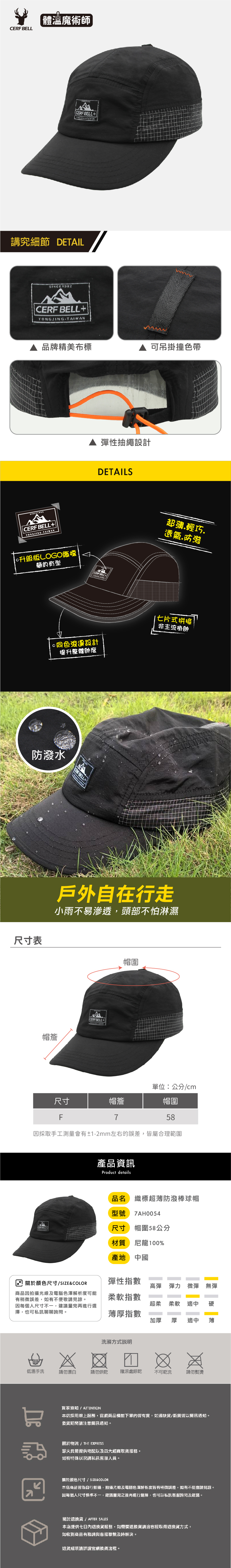 材質特性:超薄輕量布料、防潑水處理、高透氣性、質感織標設計、可調節帽圍