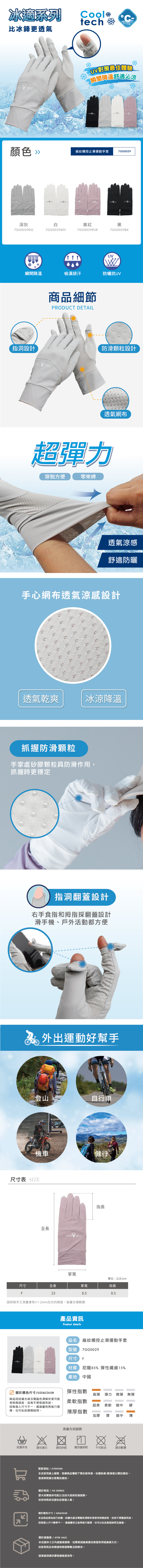 材質特性:涼感纖維+UPF50+防曬+高彈貼合+掌心止滑設計