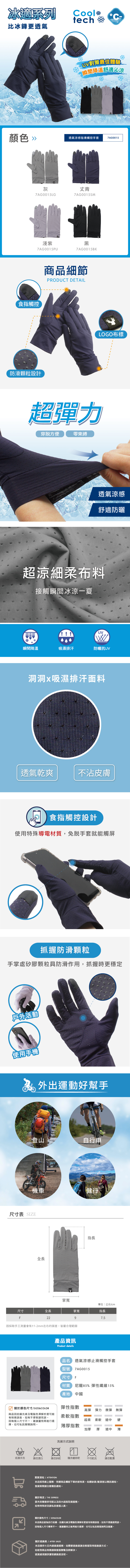 材質特性:涼感冰絲纖維+UPF50+防曬+掌心止滑+靈敏觸控設計