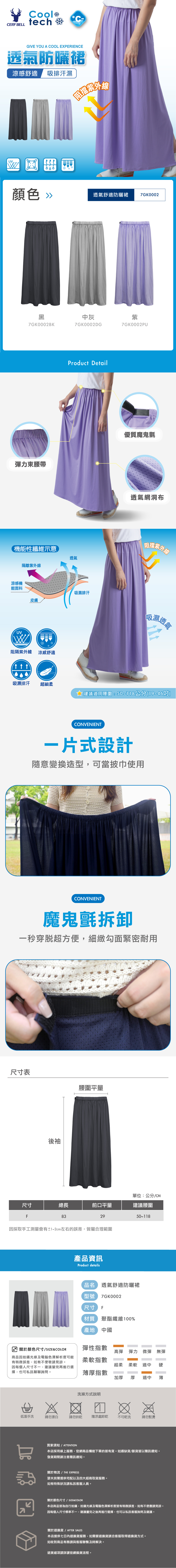 材質特性:輕盈透氣布料+涼感纖維+UPF50+高效防曬+彈性舒適